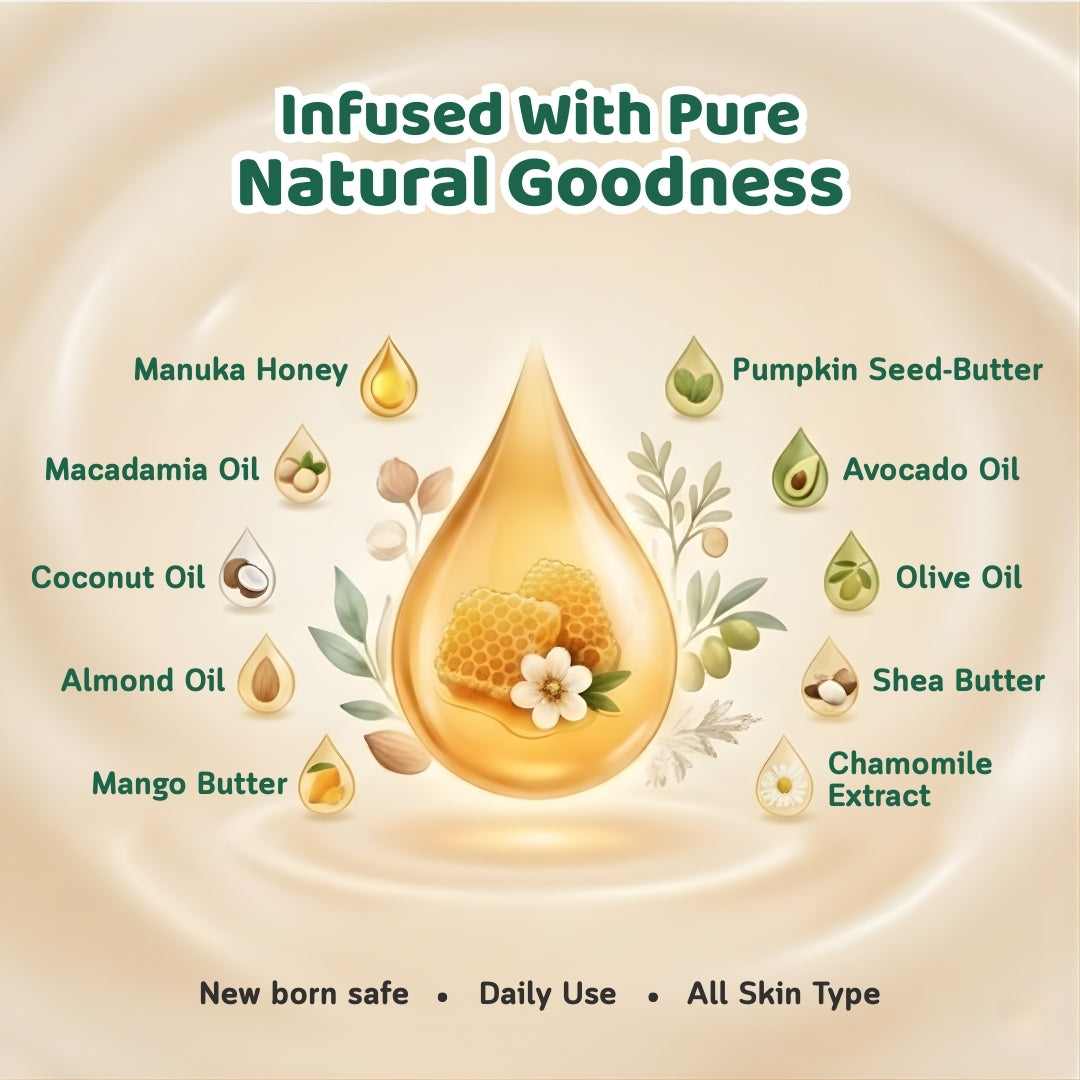 Smooth, shiny, and healthy skin for 24 hours. Our formula, with Manuka Honey, deeply hydrates and protects sensitive skin. Developed by a pediatrician and dermatologically tested for safety and effectiveness. Trust in Velura Gentle Glow for nourishment and peace of mind.