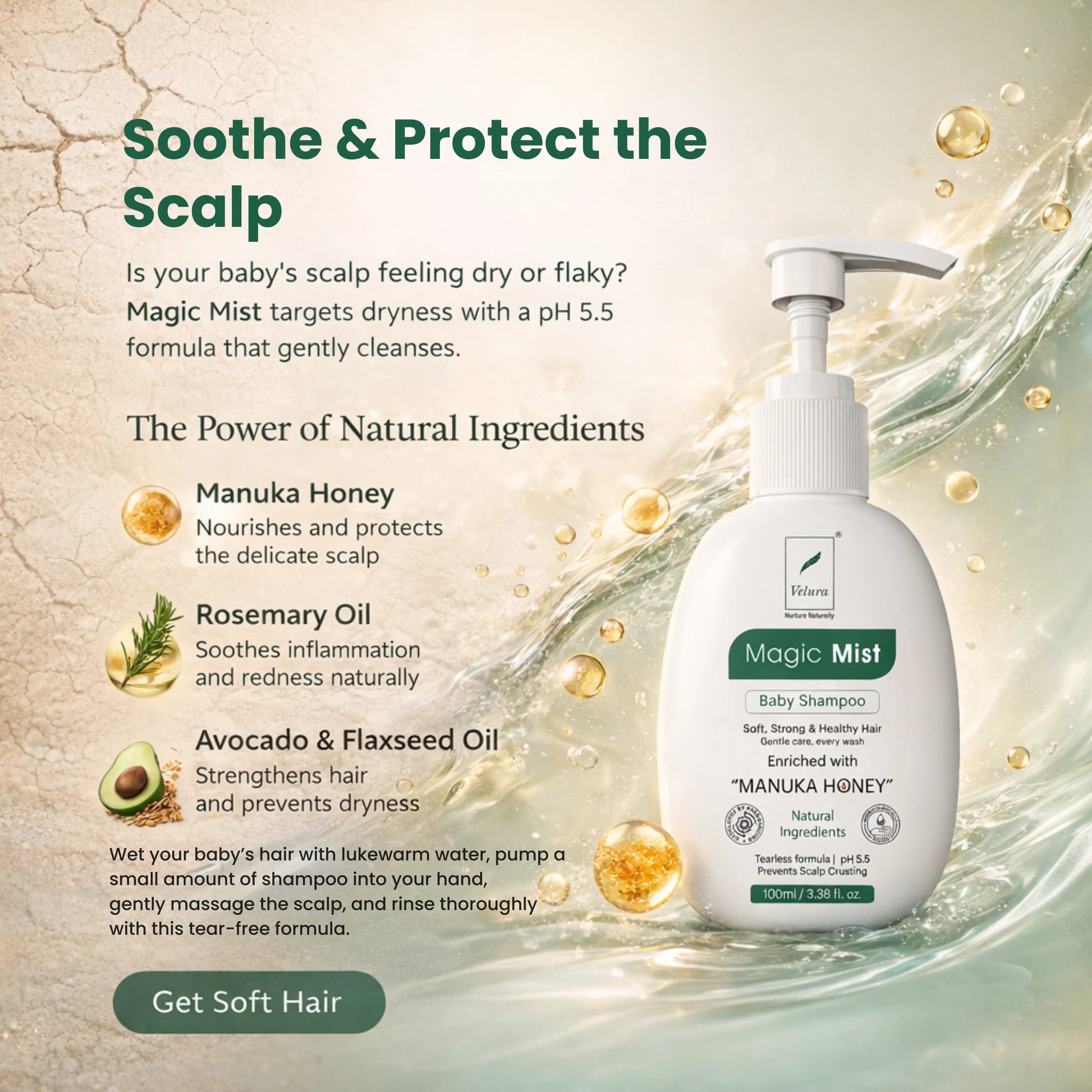 Velura Magic Mist Baby Shampoo is a gentle, tear-free formula enriched with the goodness of Manuka Honey to cleanse and nourish your baby’s delicate scalp and hair. With a pH of 5.5, it maintains the natural balance of your baby’s scalp, preventing dryness and flakiness. Dermatologically tested and FDA approved, it is free from parabens, sulphates, phthalates, artificial colours, and fragrances — ensuring a safe and soothing hair wash for your baby. Developed by pediatricians, it offers softness, strength, and long-term scalp health.